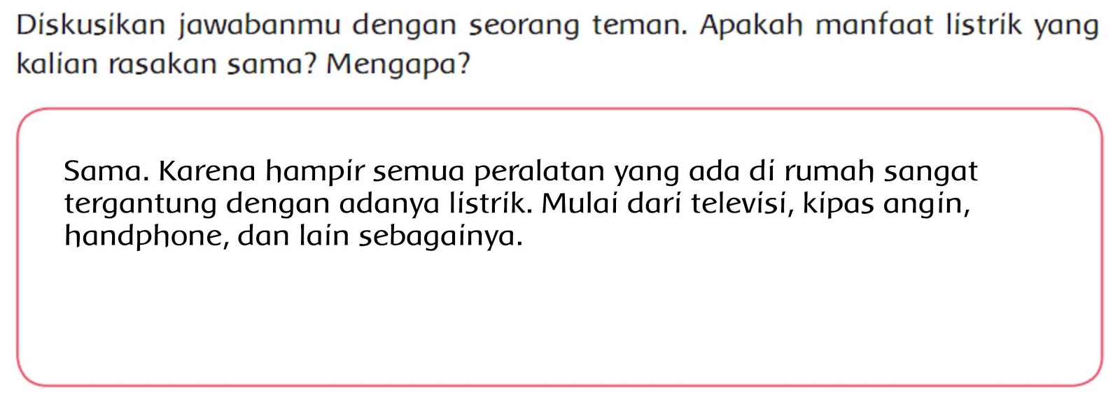 Diskusikan jawabanmu dengan seorang teman apakah manfaat listrik yang kalian rasakan sama mengapa. Ya kamu berhak mendapatkan manfaat dari listrik. Dengan adanya listrik kita dapat menonton televisi menyalakan radio menyalakan lampu dan lain lain. Dengan adanya listrik kita dapat menonton televisi menyalakan radio menyalakan lampu dan lain lain. Begitu banyak manfaat listrik bagi kehidupan kita.